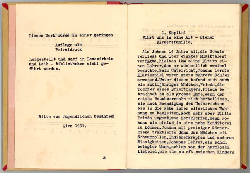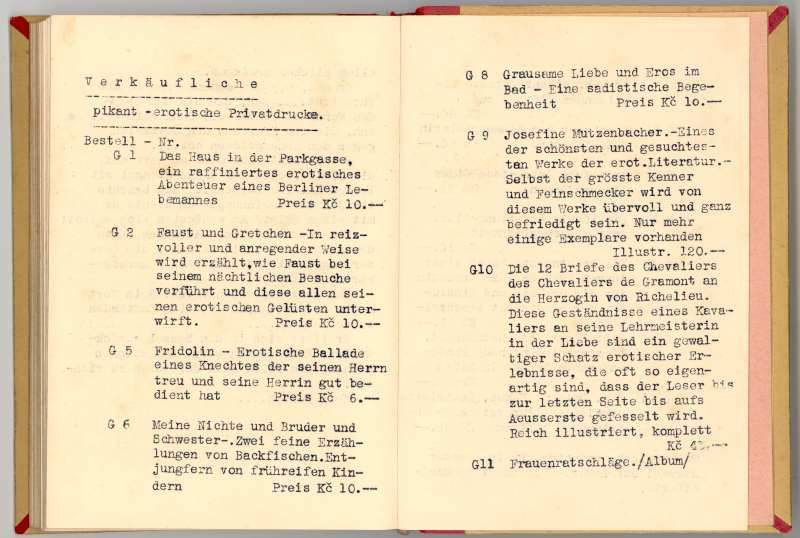 Wien 1931, privadruck. Stran 96. Cyklostylovaná německá pornografie tištěná v Čechách; na konci seznam dalších 21 svazků německých pornografických titulů s cenami v korunách. Poloplátěná vazba se zlatým tiskem na hřbetu, velmi dobrý stav. 680 Kč