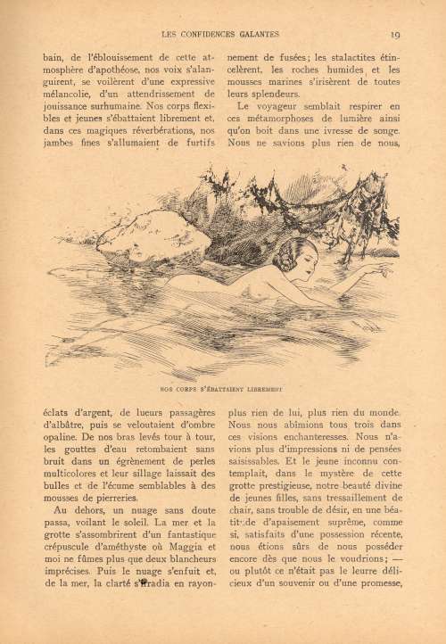 Paris 1923, Moderne - Librairie Ambert. "Galantní" povídky s mnoha půvabnými, místy erotickými ilustracemi de Ch. Érouarda. Stran 120 + reklamy; vložen objednávkový list a barevná reklama na další svazek. Původní měkká vazba v barevné obálce, dole vzadu trochu naťuknutá, jinak velmi dobrý stav. 290 Kč.