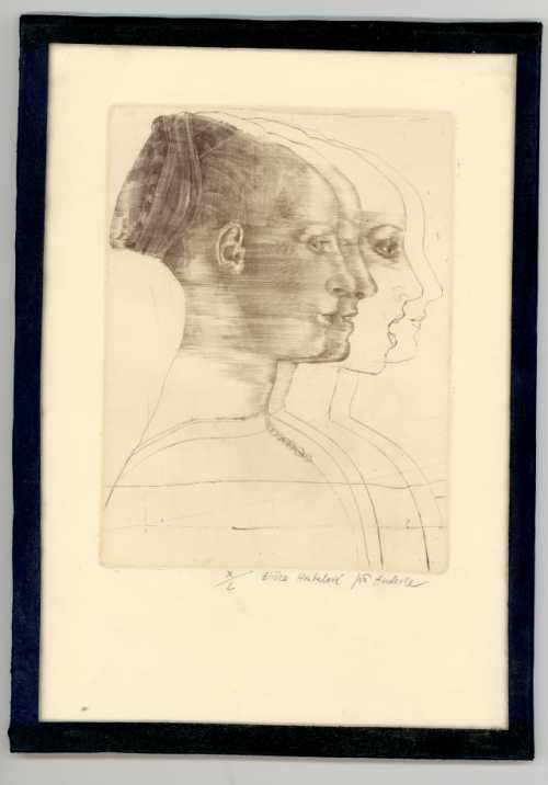Lept adjustovaný pod sklem, zezadu deska potažená plátnem, bez závěsu (pravděpodobně autorova úprava). Číslo tisku X/L. Nedatováno, podepsáno tužkou s věnováním Elišce Hrabalové. Formát skla 240x170, tisková plocha 150x115. Dobrý stav. PRODÁNO