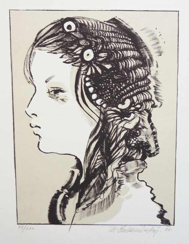 Barevná litografie, číslo tisku 36/96. Formát papíru 660x460, tisková plocha 490x320. Signováno tužkou s věnováním: "Znejmilejšímu spisovateli a hodnému člověkovi Bohouškovi Hrabalovi srdečně". Dobrý stav. PRODÁNO