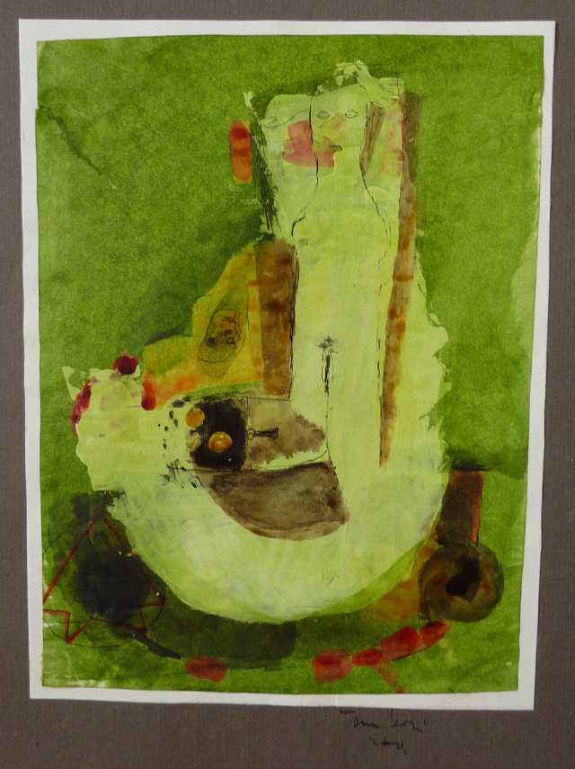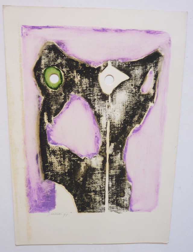 Kombinovaná technika - monotyp + malba temperou na lesklém kartonu s dvěma kulatými výseky. Signováno tužkou. Formát papíru A4, plocha malby 230x175. Dobrý stav. 890 Kč.