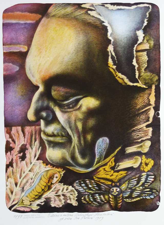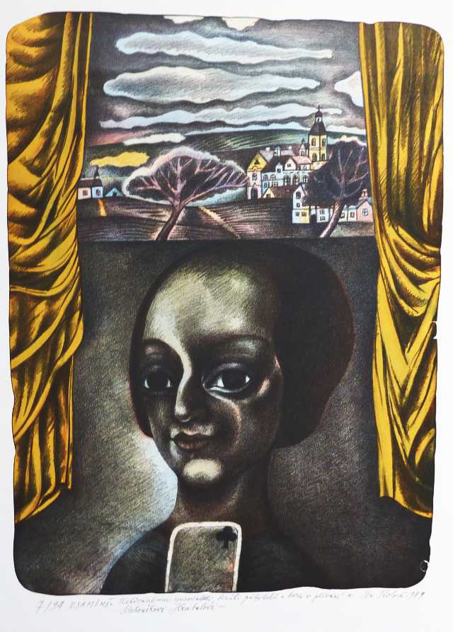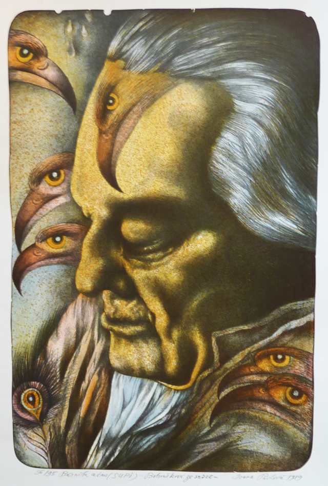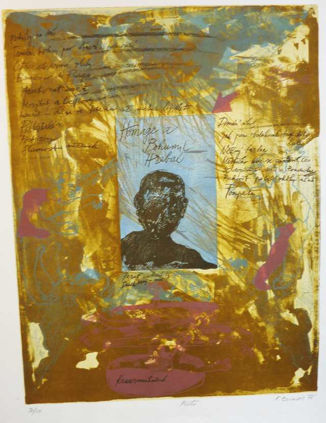 Barevná litografie, číslo tisku 7/94. Formát papíru 660x460, tisková plocha 430x320. Signováno tužkou s věnováním: "Uctívanému spisovateli, králi pábitelů a borci v plivání Bohouškovi Hrabalovi". Dobrý stav. 450 Kč.