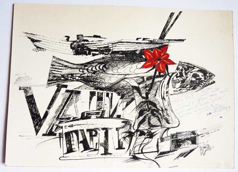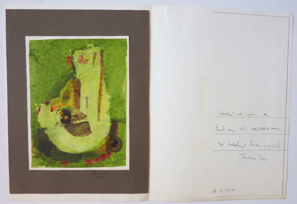 Malba (akvarel, tempera, tuš) na tenkém papíru, vylepená na bílou čtvrtku, podlepenou šedým grafickým kartonem a vše vlepeno do dvojlistu kladívkové čtvrtky. Formát malby 235x175, obalu 365x270. Signováno tuší pod obrázkem. Na přední straně dedikace "Váženému panu B. Hrabalovi", pokračující uvnitř: "Všechno nejlepší k vašim 6+5. narozeninám si dovoluje Vám popřát Eva Tomková." Dobrý stav. 690 Kč.