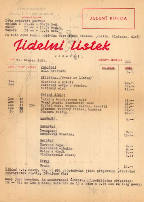 Večerní jídelní lístek Jelení Boudy z 11. března 1952.
