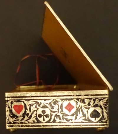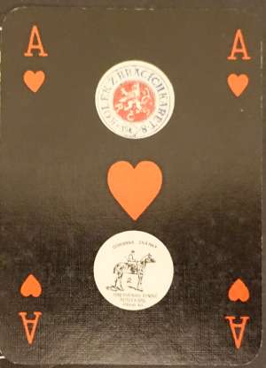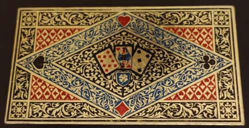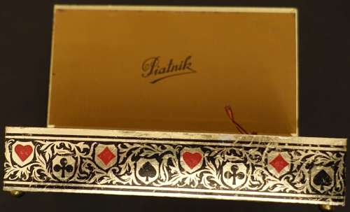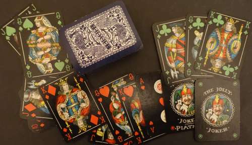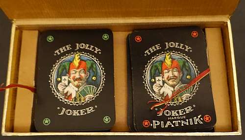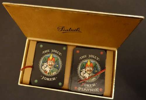 Ferd. Piatnik a synové, Ritter & spol. Praha XII, 20-30 léta. 104 základních karet (90x70) + 4 žolíky. Mimořádně luxusní černé provedení, tištěno na kvalitním raženém lakovaném papíru, okraje karet zlacené, v původní krabičce potažené stříbrnou fólií s nožičkami z mosazných nýtků, běžně používané, ale s ohledem na stáří velmi dobrý stav. 2400 Kč.